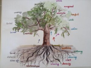 Using art to improve mental health could focus solely on the individual. But mental health and wellbeing are so interwoven with wider wellbeing that I see this as one thread within that larger tapestry. No individual will thrive unless communities and natural world thrive too. And art never exists in isolation. That’s why as I’m already outlining words to highlight in my model and method; there’ll be words like “express” and “absorb” but also “root” and “connect” (see below). I want to root art in the wider world, maybe as a way to respond to events or to react to injustice or the climate emergency, and use art and creativity to reach out and connect with others in community. Only then can art become a true tool for mental health for the individual within their world.