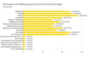 Then, we asked which aspects of wellbeing inspire you the most. Here the response was very broad, with half of you ticking ‘all of the above’ (see below). Nature perenially tops the list of our readers’ and followers’ favourite topics, but happiness, health and kindness all scored highly and there is a strong interest in creativity and sustainability. Wellbeing projects, people in wellbeing and economics score lower but still interest many. It’s clear that our readers and followers take a broad view of wellbeing and are interested in many different aspects of it.